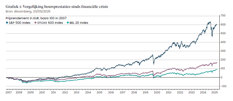 De BEL 20 bleef duidelijk achter. De Amerikaanse S&P 500 bereikte al na vijf en een half jaar opnieuw een record, terwijl de Europese STOXX 600 midden 2015 herstelde. Beide indices profiteerden van een grotere spreiding en een sterke vertegenwoordiging van technologiebedrijven, iets wat de BEL 20 grotendeels mist.