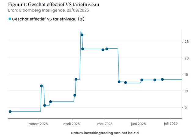 Hoewel dit uiteraard niet alles zegt, claimt Bloomberg dat de huidige heffingen eerder zorgen voor een gemiddeld tarief van 15,2% (figuur 1) voor goederen die via wereldwijde handelsstromen de Verenigde Staten bereiken.